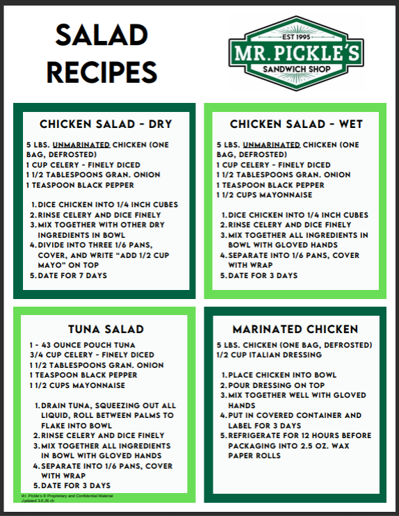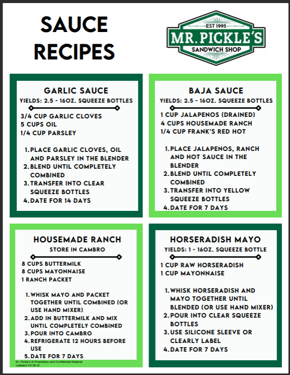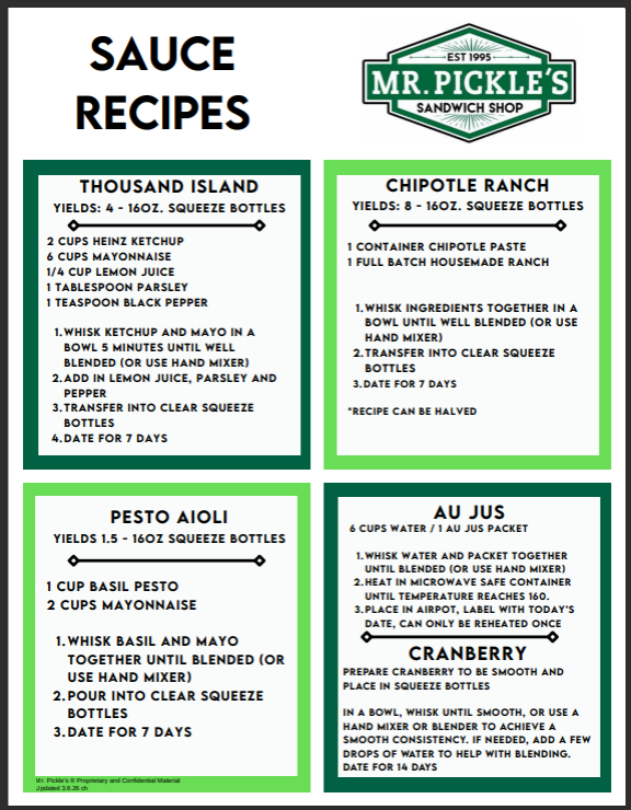 Prep Recipes - Updated 3.6.26 Christy Hanks March 09, 2026 16:57 Updated Follow Prep Recipes Related articles Mama Mia - Updated 3.10.26 Buffalo and Chicken Fajita Wraps - Updated 3.10.26 Batch Cooked Bacon - Updated 3.7.25 Baja Sauce Prep Cucumber Prep Comments 0 comments Article is closed for comments.