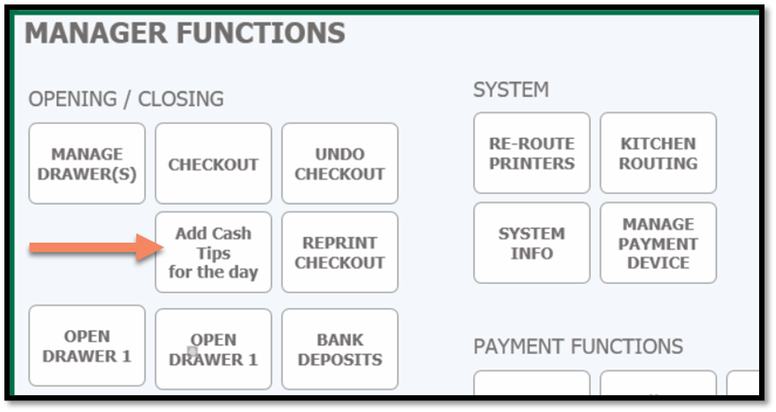 You can add a cash tip to the POS by going to the Manager menu and on the left-hand side you will see: