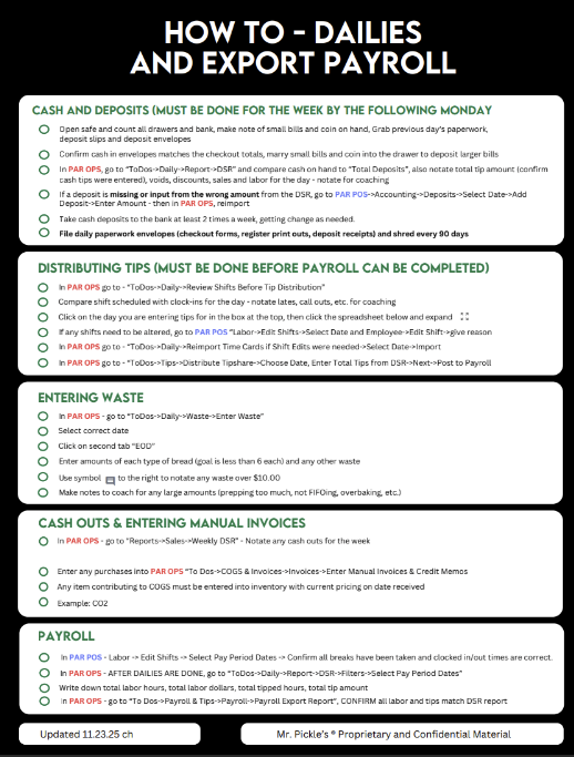 How to Dailies - Updated 11.23.25 Christy Hanks November 23, 2025 18:59 Updated Follow How to DailiesHow to: Edit Timecards Distribute Tips Enter Waste Enter Manual Invoices Export Payroll Comments 0 comments Article is closed for comments.
