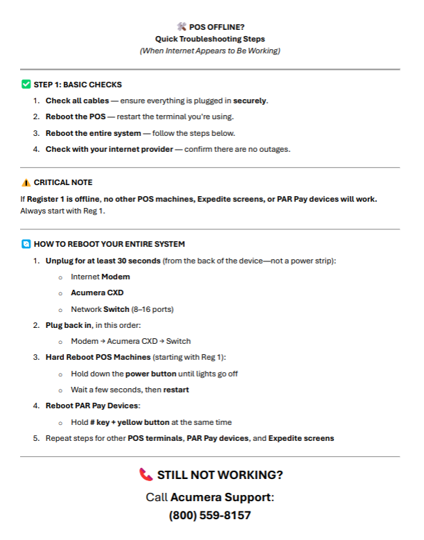 POS Offline Troubleshooting - Updated 7.7.25 Christy Hanks July 07, 2025 20:13 Updated Follow POS Offline Guide Comments 0 comments Article is closed for comments.